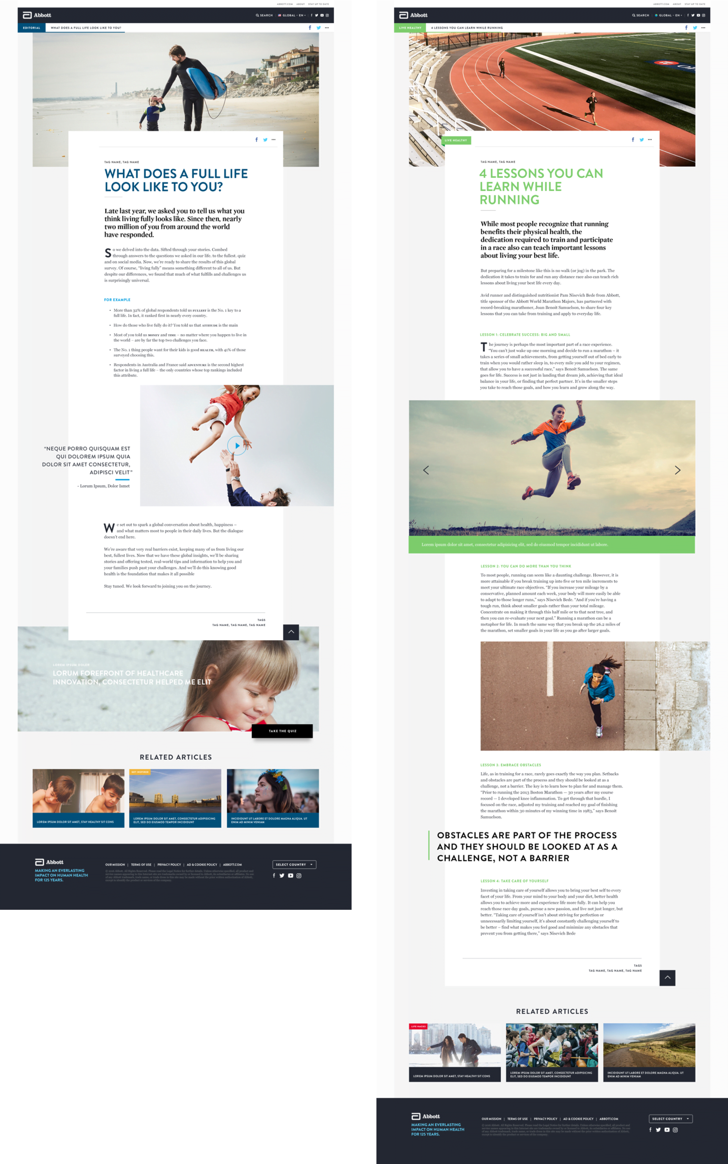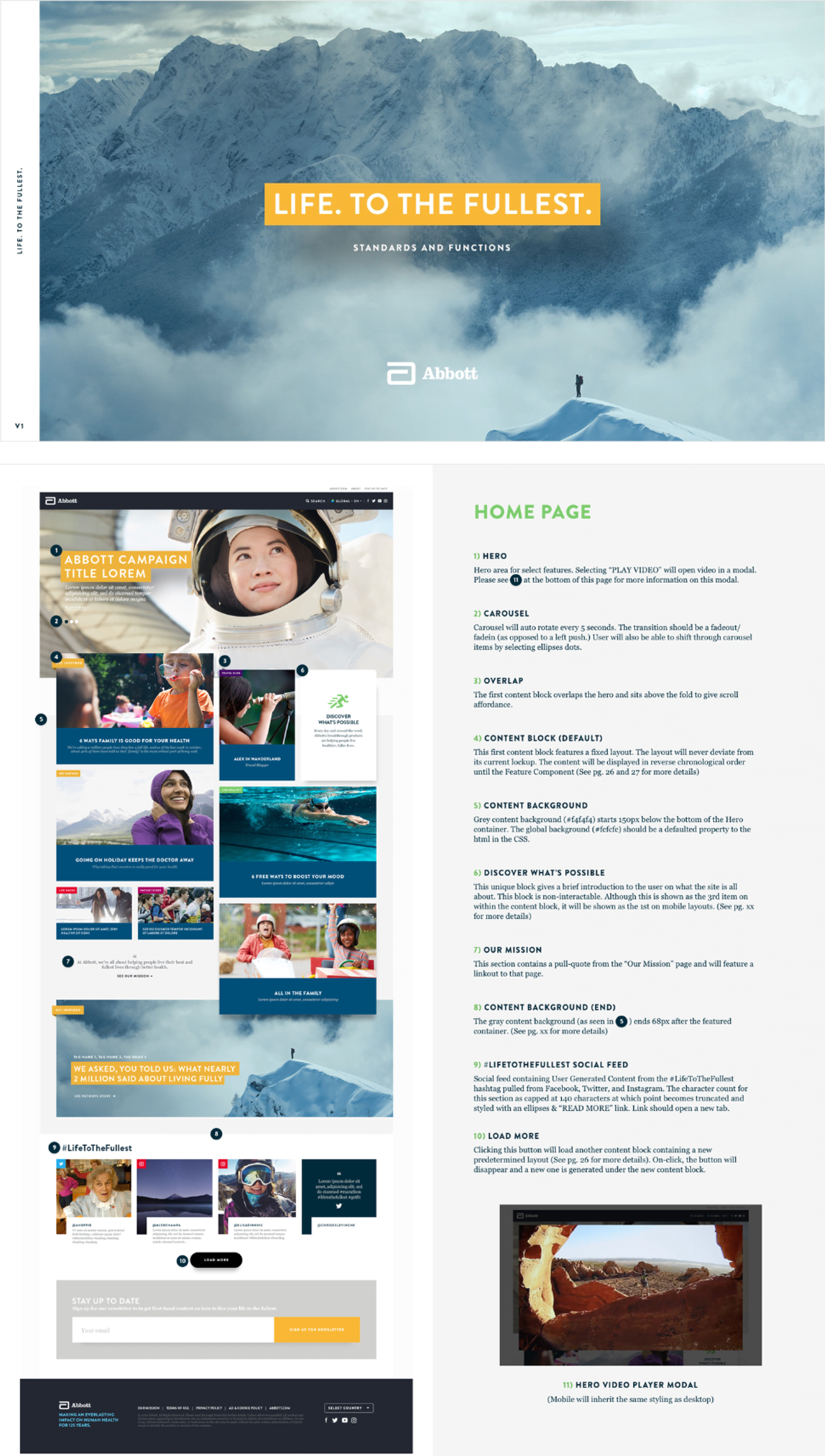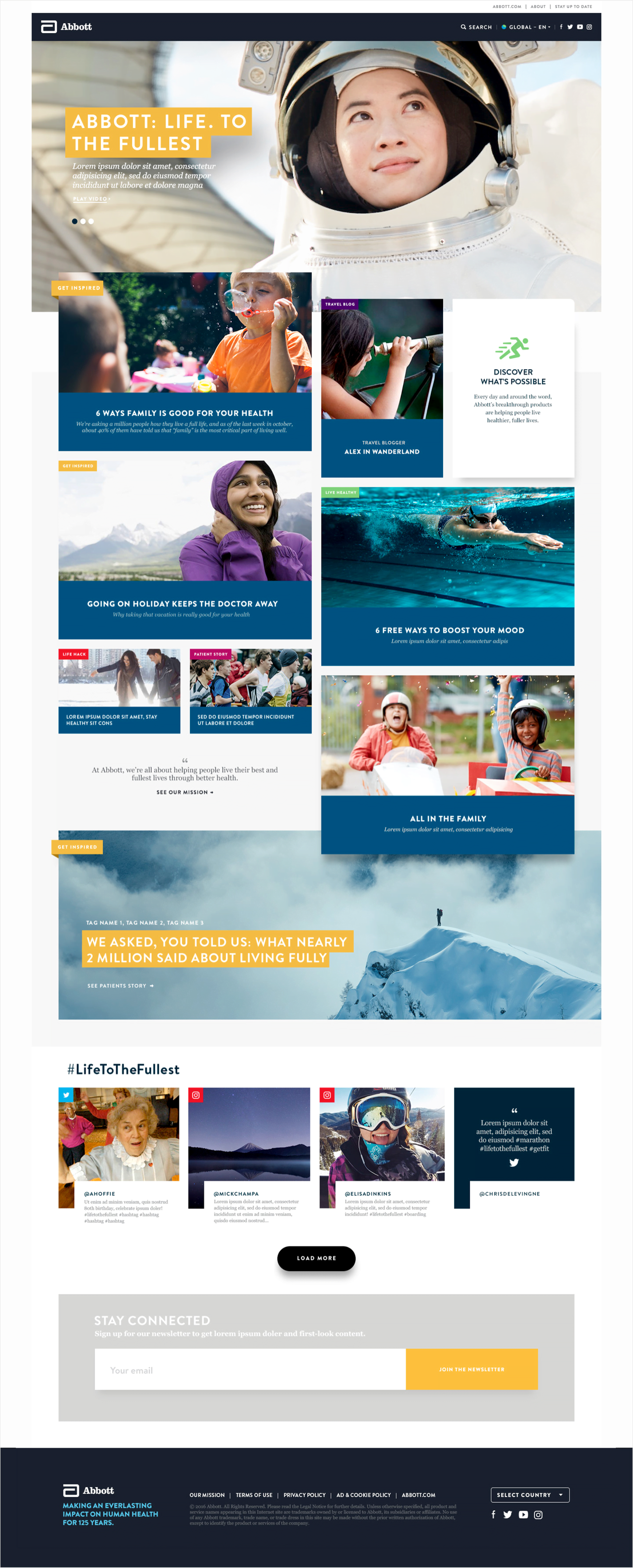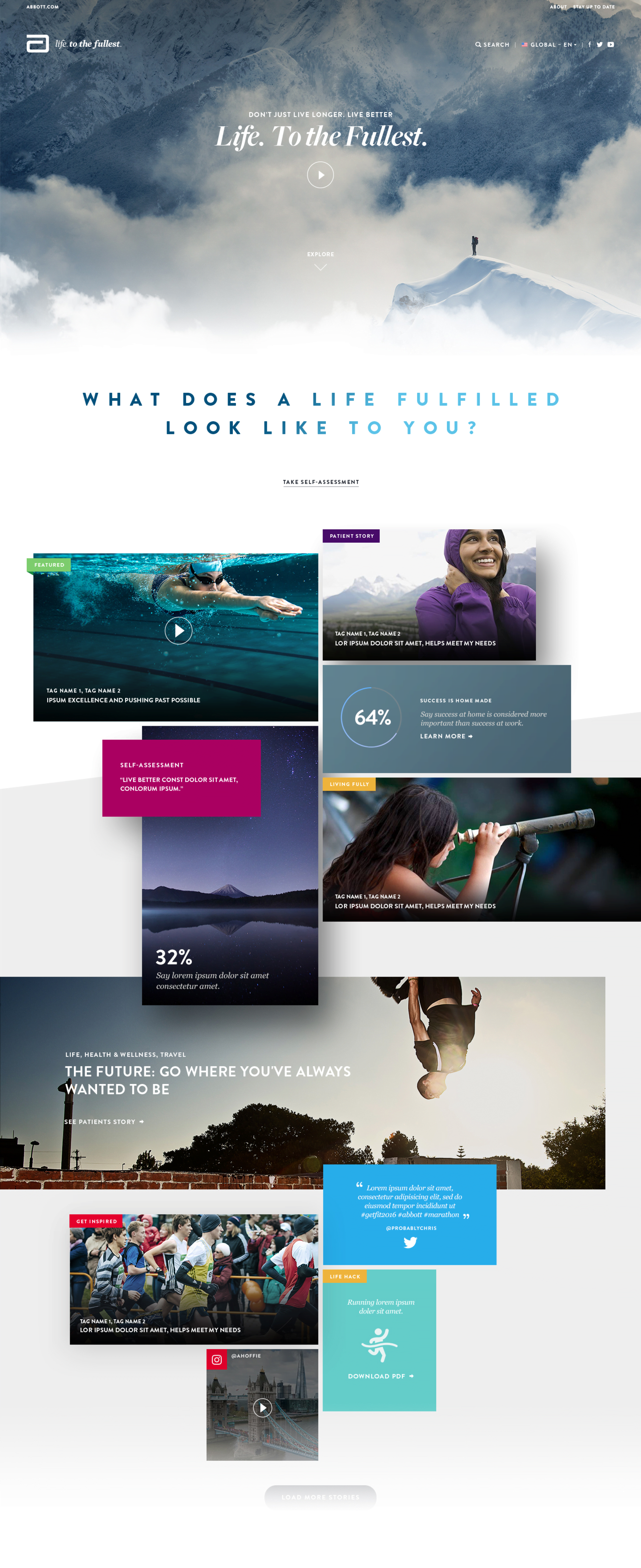 - Abbott. Life to the Fullest, is Abbott’s brand platform dedicated to helping others live their best, healthiest lives. I was tasked with designing 2 ownable, approachable design concepts (one of them to be chosen to function as their completely CMSable brand platform) as well as the creation of a fully annotated standards & functional spec documentation.
